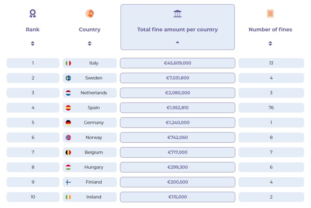 L'Italia si aggiudica il primo posto per distacco, elevando sanzioni per un importo sei volte maggiore della seconda classificata, la Svezia. Spagna scatenata per il numero delle multe, che però hanno un ammontare complessivo sensibilmente più basso. La privacy sembra essere un concetto relativo sulle sponde del Mediterraneo? In realtà, questa classifica dimostra innanzitutto l'efficacia delle normative che sono state recepite e applicate praticamente da tutti i paesi. In secondo luogo, evidenzia come le Autorità preposte al controllo siano più attive e attente che mai.
